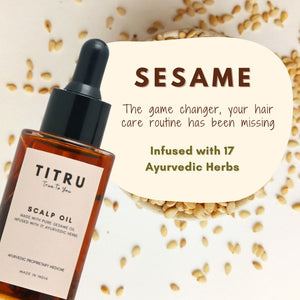 Titru Scalp Oil is your all-in-one Ayurvedic ritualfor stronger roots, healthier scalp, and hair that actually grows. Made with cold-pressed sesame oil and 17 powerful herbs, it nourishes deep, boosts blood flow, calms inflammation, and brings back your natural shine.